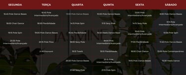 As aulas de Pole Dance são separadas por níveis, sendo ideal para iniciantes a aula de Pole Dance Bases. As demais modalidades são abertas a todos os níveis (inclusive iniciantes).